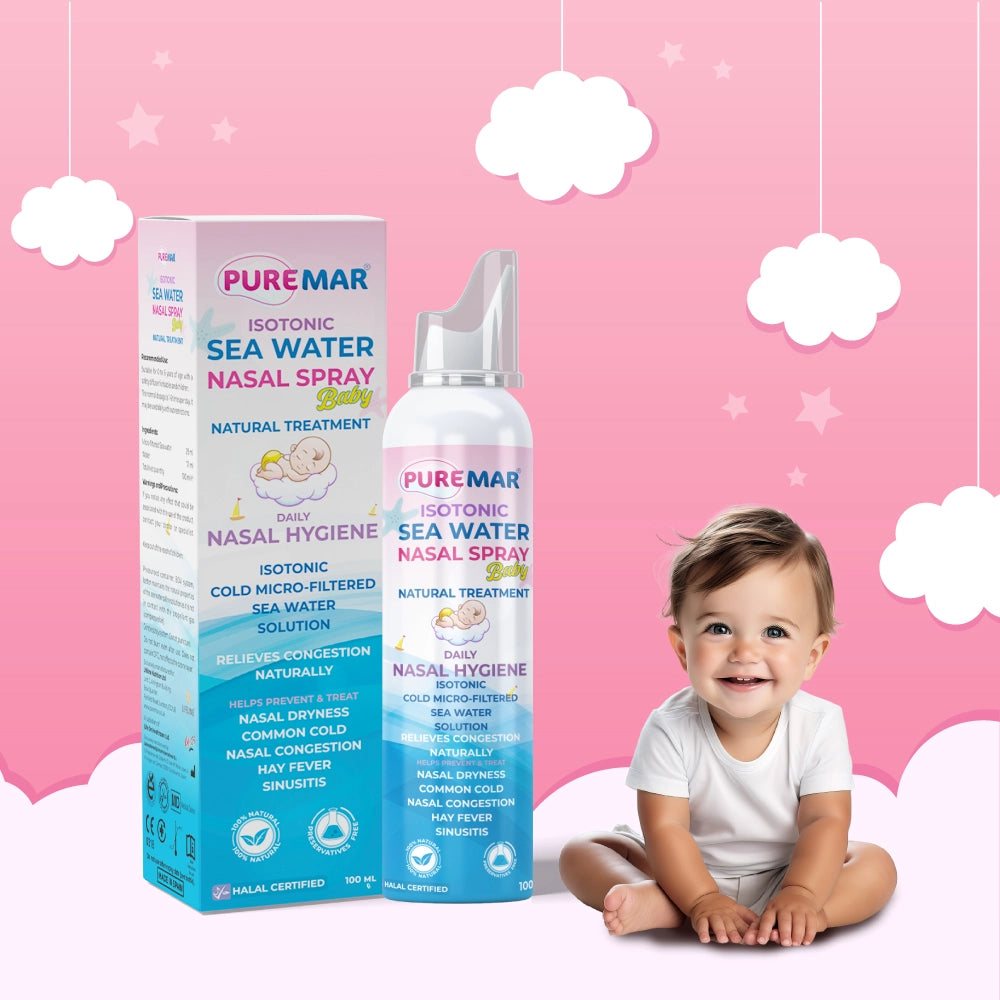 Puremar ISOTONIC SEA WATER NASAL SPRAY (BABY) is the ideal nasal spray for paediatric use with specially designed child friendly nossle. It is a 100% natural, cold microfiltered isotonic seawater solution that moisturizes the nasal mucosa and facilitates the removal of nasal secretions from a baby or child who is under 6 years of age.