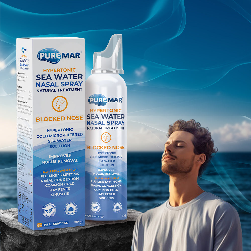 Experience fast relief from nasal congestion with Puremar's HYPERTONIC SEA WATER NASAL SPRAY. Our powerful formula swiftly clears airways, combining pure seawater with decongestant properties. Ideal for severe cold, flu, catarrh symptoms, and allergic rhinitis.